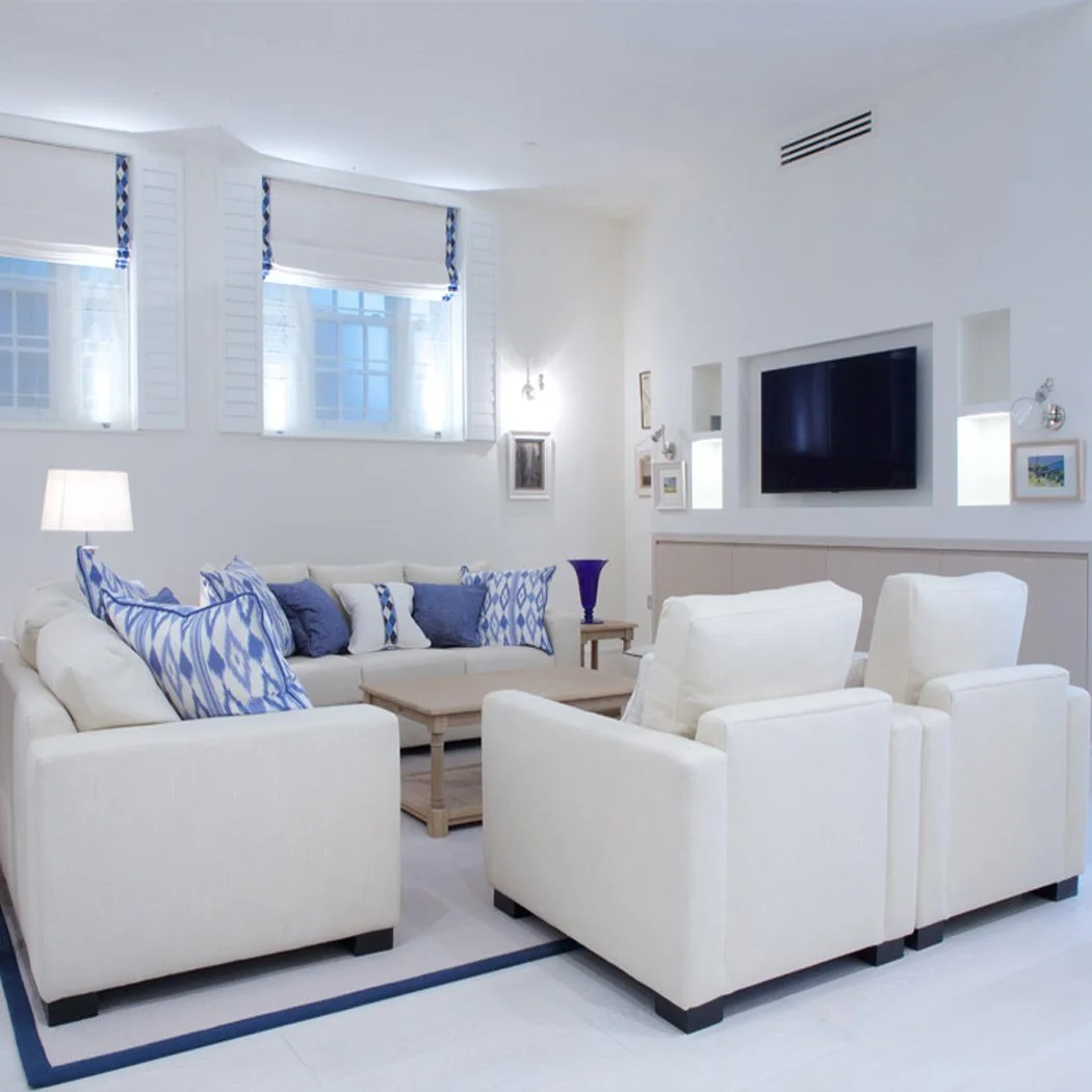 Having discussed styles in depth, New England/Cape Cod was agreed on and we starting building a fresh, bright, light scheme which used tones of blues and white throughout the property.
